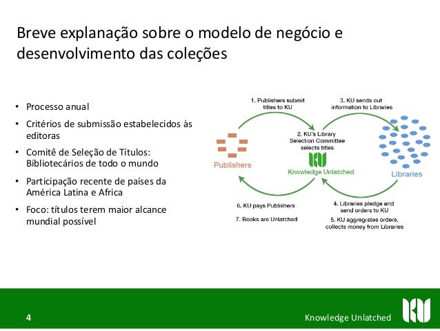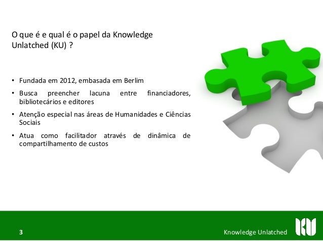 3. 3. 3 Knowledge Unlatched • Fundada em 2012, embasada em Berlim • Busca preencher lacuna entre financiadores, bibliotecários e editores • Atenção especial nas áreas de Humanidades e Ciências Sociais • Atua como facilitador através de dinâmica de compartilhamento de custos O que é e qual é o papel da Knowledge Unlatched (KU) ?