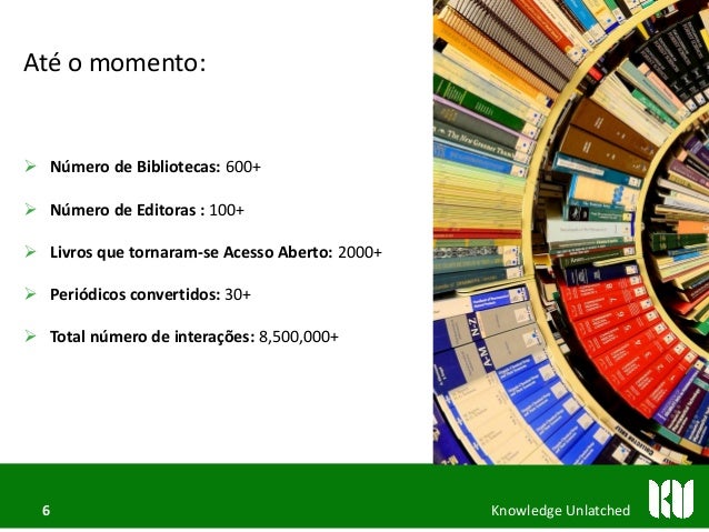 6. 6. 6 Knowledge Unlatched Até o momento: Ø Número de Bibliotecas: 600+ Ø Número de Editoras : 100+ Ø Livros que tornaram-se Acesso Aberto: 2000+ Ø Periódicos convertidos: 30+ Ø Total número de interações: 8,500,000+