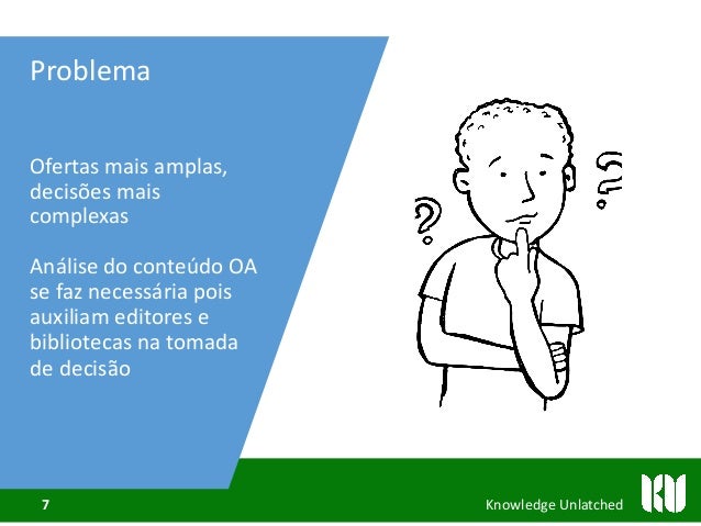 7. 7. 7 Knowledge Unlatched Ofertas mais amplas, decisões mais complexas Análise do conteúdo OA se faz necessária pois auxiliam editores e bibliotecas na tomada de decisão Problema