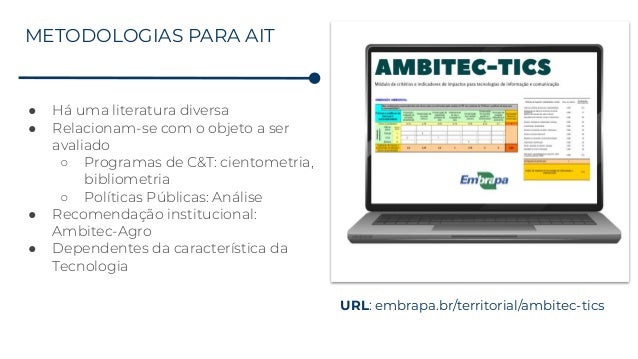 10. 10. ● Há uma literatura diversa ● Relacionam-se com o objeto a ser avaliado ○ Programas de C&T: cientometria, bibliometria ○ Políticas Públicas: Análise ● Recomendação institucional: Ambitec-Agro ● Dependentes da característica da Tecnologia METODOLOGIAS PARA AIT https://bs.sede.embrapa.br/ URL: embrapa.br/territorial/ambitec-tics