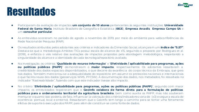 11. 11. Resultados ● Participaram da avaliação de impactos um conjunto de 10 atores pertencentes às seguintes instituições: Universidade Federal de Santa Maria, Instituto Brasileiro de Geografia e Estatística (IBGE), Empresa Arcadis, Empresa Campo SA e um consultor particular. ● As entrevistas ocorreram no período de agosto a novembro de 2019, por meio do ambiente para webconferências da Rede Nacional de Pesquisa (RNP). ● Os resultados atribuídos pelos adotantes aos critérios e indicadores da Dimensão Social, alcançaram um índice de “5.57”. Destaca-se que a metodologia Ambitec-TICs possui escala de alcance de ±15, seguindo o proposto por Rodrigues et al. (2018), e enfatiza o viés relativo das avaliações de impactos propostas pela abordagem metodológica, respeitando a singularidade do alcance e a identidade de cada tecnologia/repositório avaliado. ● Na investigação, os critérios “Qualidade do recurso Informação” e “Efetividade / aplicabilidade para programas, ações ou políticas públicas (PAPP)” demonstraram o maior impacto, respectivamente. Os adotantes ressaltaram a credibilidade dos dados espaciais disponibilizados, o que decorre da excelência do corpo técnico da Embrapa, que gera tais dados. Também mencionou-se a adequabilidade do repositório em assumir os protocolos nacionais e internacionais o que facilita reuso dos dados (geoserviços WMS, PYCSW). A documentação dos dados, nos metadados, foi ressaltada no indicador “Rastreabilidade”, fazendo com que este indicador tivesse alto impacto. ● No critério “Efetividade / aplicabilidade para programas, ações ou políticas públicas (PAPP)”, segundo com maior impacto, os entrevistados registraram que o GeoInfo colabora de forma direta para a formulação de políticas públicas para o ordenamento territorial da agricultura brasileira, bem como auxilia os PAPP, mas não souberam mensurar o quanto isso poderia, de fato, influenciar (a valoração dos critérios/indicadores varia de (±3) e segue a escala de ocorrência: pontual, local e entorno). Ressaltaram que o GeoInfo tem longo a caminho para se tornar uma ferramenta efetiva de suporte à execução dos PAPP, para além de constituir-se como fonte de dados.