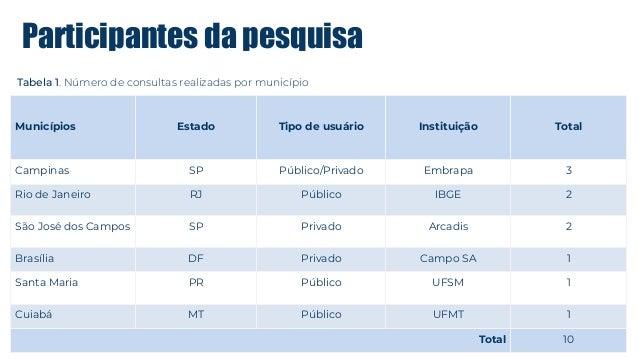 12. 12. Participantes da pesquisa Municípios Estado Tipo de usuário Instituição Total Campinas SP Público/Privado Embrapa 3 Rio de Janeiro RJ Público IBGE 2 São José dos Campos SP Privado Arcadis 2 Brasília DF Privado Campo SA 1 Santa Maria PR Público UFSM 1 Cuiabá MT Público UFMT 1 Total 10 Tabela 1. Número de consultas realizadas por município