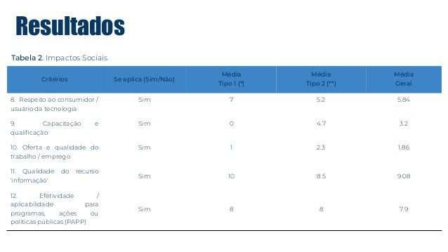 13. 13. Resultados Critérios Se aplica (Sim/Não) Média Tipo 1 (*) Média Tipo 2 (**) Média Geral 8. Respeito ao consumidor / usuário da tecnologia Sim 7 5.2 5.84 9. Capacitação e qualificação Sim 0 4.7 3.2 10. Oferta e qualidade do trabalho / emprego Sim 1 2.3 1.86 11. Qualidade do recurso 'informação' Sim 10 8.5 9.08 12. Efetividade / aplicabilidade para programas, ações ou políticas públicas (PAPP) Sim 8 8 7.9 Tabela 2. Impactos Sociais