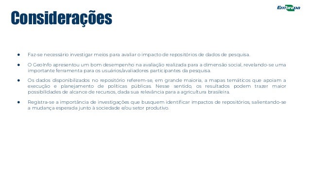 14. 14. Considerações ● Faz-se necessário investigar meios para avaliar o impacto de repositórios de dados de pesquisa. ● O GeoInfo apresentou um bom desempenho na avaliação realizada para a dimensão social, revelando-se uma importante ferramenta para os usuários/avaliadores participantes da pesquisa. ● Os dados disponibilizados no repositório referem-se, em grande maioria, a mapas temáticos que apoiam a execução e planejamento de políticas públicas. Nesse sentido, os resultados podem trazer maior possibilidades de alcance de recursos, dada sua relevância para a agricultura brasileira. ● Registra-se a importância de investigações que busquem identificar impactos de repositórios, salientando-se a mudança esperada junto à sociedade e/ou setor produtivo.