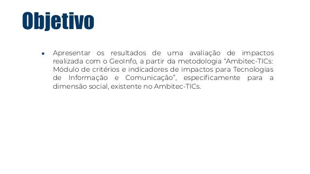 2. 2. Objetivo ● Apresentar os resultados de uma avaliação de impactos realizada com o GeoInfo, a partir da metodologia “Ambitec-TICs: Módulo de critérios e indicadores de impactos para Tecnologias de Informação e Comunicação”, especificamente para a dimensão social, existente no Ambitec-TICs.