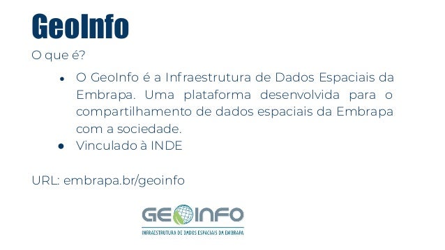3. 3. GeoInfo O que é? ● O GeoInfo é a Infraestrutura de Dados Espaciais da Embrapa. Uma plataforma desenvolvida para o compartilhamento de dados espaciais da Embrapa com a sociedade. ● Vinculado à INDE URL: embrapa.br/geoinfo