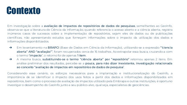 5. 5. Contexto Em investigação sobre a avaliação de impactos de repositórios de dados de pesquisas, semelhantes ao GeoInfo, observa-se que a literatura de Ciência da Informação, quando referencia o acesso aberto e a ciência aberta, registra inúmeros casos de sucessos sobre a implementação de repositórios, sejam eles de dados ou de publicações científicas, não apresentando estudos que forneçam informações sobre o impacto da utilização dos dados e informações disponibilizados. ➔ Em levantamento na BRAPCI (Base de Dados em Ciência da Informação), utilizando-se a expressão “’ciencia aberta” AND “avaliação’”, foram recuperados cerca de 16 trabalhos. Ao extrapolar essa busca, cruzando-a com o termo “impacto”, o retorno foi de apenas 1 item. ➔ A mesma busca, substituindo-se o termo “ciência aberta” por “repositório” retornou apenas 2 itens. Em análise preliminar dos resultados, percebe-se a pouca, para não dizer inexistente, investigação relacionada ao conceito “avaliação de impactos em repositórios de dados de pesquisa”. Considerando esse cenário, os esforços necessários para a implantação e institucionalização do GeoInfo, a importância de se identificar o impacto dos usos feitos a partir dos dados e informações disponibilizados em repositórios, bem como o processo de avaliação de impactos utilizado pela Embrapa e outras instituições, é oportuno investigar o desempenho do GeoInfo junto a seu público-alvo, qual seja, especialistas de geociências.
