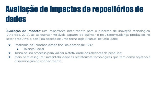 6. 6. Avaliação de Impactos de repositórios de dados Avaliação de impacto: um importante instrumento para o processo de inovação tecnológica (Andrade, 2012), ao apresentar variáveis capazes de estimar o resultado/mudança produzido no setor produtivo, a partir da adoção de uma tecnologia (Manual de Oslo, 2018). ➔ Realizada na Embrapa desde final da década de 1980; ◆ Balanço Social ➔ Torna-se um processo para validar a efetividade dos alcances da pesquisa; ➔ Meio para assegurar sustentabilidade às plataformas tecnológicas que tem como objetivo a disseminação do conhecimento;
