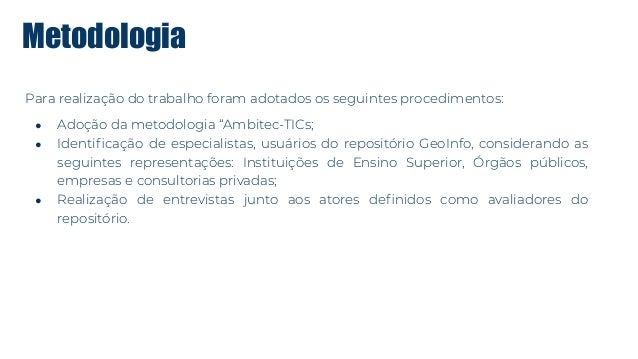 7. 7. Metodologia Para realização do trabalho foram adotados os seguintes procedimentos: ● Adoção da metodologia “Ambitec-TICs; ● Identificação de especialistas, usuários do repositório GeoInfo, considerando as seguintes representações: Instituições de Ensino Superior, Órgãos públicos, empresas e consultorias privadas; ● Realização de entrevistas junto aos atores definidos como avaliadores do repositório.