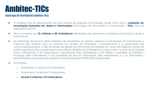 8. 8. Ambitec-TICs embrapa.br/territorial/ambitec-tics ● O Ambitec-TICs foi desenvolvido por seis centros de pesquisa da Embrapa, tendo como foco a avaliação de tecnologias baseadas em dados e informações (Tecnologias da Informação e Comunicação - TICs), caso do repositório GeoInfo. ● Ele é composto por 12 critérios e 65 indicadores distribuídos nas dimensões: Ambiental, Econômica, Social e Institucional. ● Na dimensão Social, foco deste trabalho, são abordados os critérios relativos à contribuição do GeoInfo para a melhoria das relações com os usuários (no âmbito do Embrapa), o envolvimento e a capacitação dos consumidores/usuários, e dos processos de gestão da informação tecnológica em favor dos objetivos sociais de políticas públicas. São considerados cinco critérios, dirigidos ao (i) Respeito ao consumidor / usuário da tecnologia (cinco indicadores), à (ii) Capacitação e qualificação (seis indicadores), à (iii) Oferta e qualidade do trabalho / emprego (sete indicadores), à (iv) Qualidade do recurso informação; (seis indicadores), e à (v) Efetividade / Aplicabilidade para programas, ações ou Políticas Públicas (PAPP) (sete indicadores). ● Dimensões: o Ambiental: 4 critérios e 23 indicadores o Econômica: 3 critérios e 13 indicadores o Social: 5 critérios e 27 indicadores