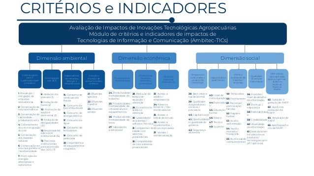 9. 9. CRITÉRIOS e INDICADORES Avaliação de Impactos de Inovações Tecnológicas Agropecuárias Módulo de critérios e indicadores de impactos de Tecnologias de Informação e Comunicação (Ambitec-TICs) Dimensão ambiental Contribuição aos ODS Dependência de materiais, energia e infraestrutura 8. Redução da pobreza (1) 9. Redução da fome (2) 10. Promoção da saúde e bem-estar (3) 11. Redução de desigualdades (10) 12.Responsabilid ade social institucional (16) 13. Parcerias institucionais para promoção dos ODS (17) 14. Consumo de combustíveis fósseis 15. Consumo de biocombustíveis 16. Consumo de energia elétrica 17. Consumo de água 18. Consumo de fertilizantes 19. Consumo de pesticidas 20. Dependência de equipamentos e logística Dimensão econômica Produtividade / Rentabilidade Eficiência na Aquisição de dados / informações 24. Produtividade / Rentabilidade do trabalho 25. Produtividade / Rentabilidade da infraestrutura e equipamentos 26. Produtividade / Rentabilidade da terra 27. Valorização patrimonial 28. Redução do tempo de aquisição / obtenção 29. Economia no acesso e obtenção 30. Usabilidade do sistema / software / técnica 31.Complemen-ta ridade com sistemas preexistentes 32.Compatibilida de com sistemas preexistentes Dimensão social Respeito ao consumidor / usuário da tecnologia Capacitação e qualificação 38. Bem estar e saúde animal 39. Qualidade dos produtos / serviços / processos 40. Capital social 41. Oportunidade e igualdade de gêneros 42. Segurança alimentar 43. Local de curta duração 44.Especializaçã o 45. Educação formal 46. Básico 47. Técnico 48. Superior Contribuições para a sustentabilidade ambiental 1. Prevenção / mitigação de emissões atmosféricas 2. Conservação de recursos hídricos 3. Conservação da capacidade produtiva do solo 4. Ordenamento do uso e ocupação do solo 5. Conservação dos habitats naturais 6. Conservação de recursos genéticos / biodiversidade 7. Promoção de energias alternativas e autonomia Geração / emissão de contaminantes / resíduos 21. Efluentes gasosos 22. Efluentes líquidos 23. Efluentes sólidos Acesso a Recursos financeiros 33. Acesso a crédito / empréstimos 34. Acesso a fomento / não reembolsáveis 35. Acesso a bolsas de estudo 36. Acesso a investimentos / recursos privados 37. Vendas / comercialização Oferta e qualidade do trabalho / emprego 49. Temporário 50. Permanente 51. Parcerias / participação familiar 52. Registro formal 53. Auxílio alimentação 54. Auxílio moradia / transporte 55. Auxílio saúde (complementar) Qualidade do recurso 'informação' 56. Precisão / nível de detalhe da informação 57. Back-up / segurança 58.Rastreabilidad e 59. Credibilidade 60. Atualidade da informação 61.Desdobramen tos para novos produtos / tecnologias (spin off / spill over) Efetividade / Aplicabilidade para programas, ações ou Políticas Públicas (PAPP) 62. Subsídio à geração de PAPP 63. Auxílio na execução de PAPP 64. Ampliação de PAPP 65.Aperfeiçoame nto de PAPP