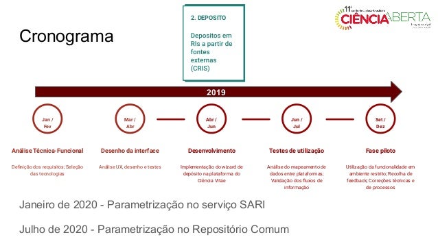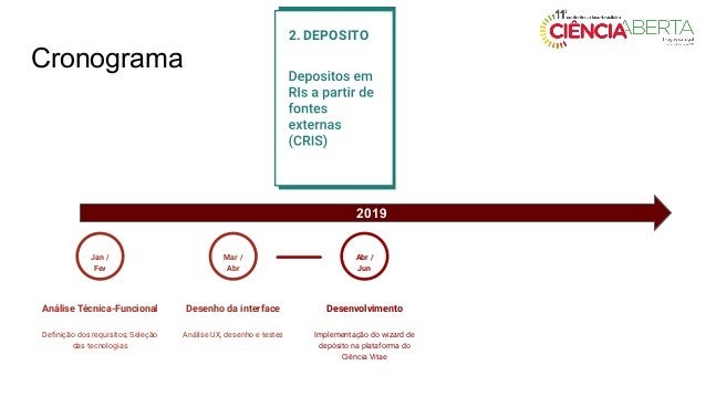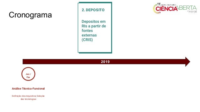 10. 10. Cronograma Jan / Fev Análise Técnica-Funcional Definição dos requisitos; Seleção das tecnologias Desenho da interface Análise UX, desenho e testes Mar / Abr Desenvolvimento Implementação do wizard de depósito na plataforma do Ciência Vitae Abr / Jun 2019 2. DEPOSITO