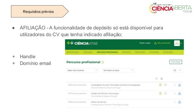12. 12. ● AFILIAÇÃO - A funcionalidade de depósito só está disponível para utilizadores do CV que tenha indicado afiliação; + Handle + Domínio email Requisitos prévios