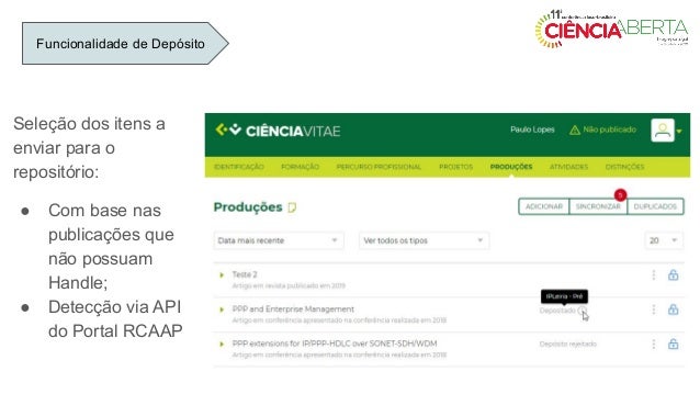 13. 13. Seleção dos itens a enviar para o repositório: ● Com base nas publicações que não possuam Handle; ● Detecção via API do Portal RCAAP Funcionalidade de Depósito
