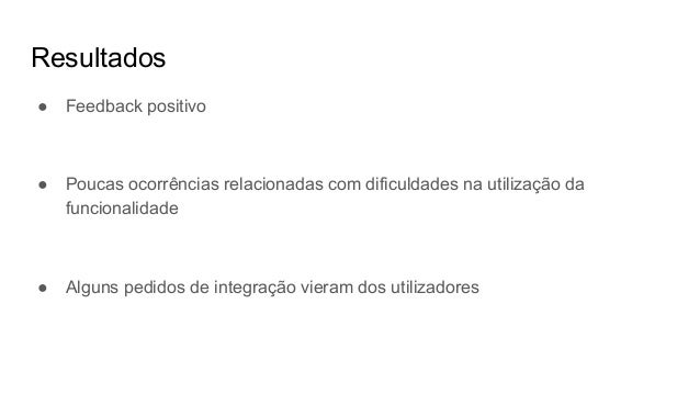 17. 17. Resultados ● Feedback positivo ● Poucas ocorrências relacionadas com dificuldades na utilização da funcionalidade ● Alguns pedidos de integração vieram dos utilizadores
