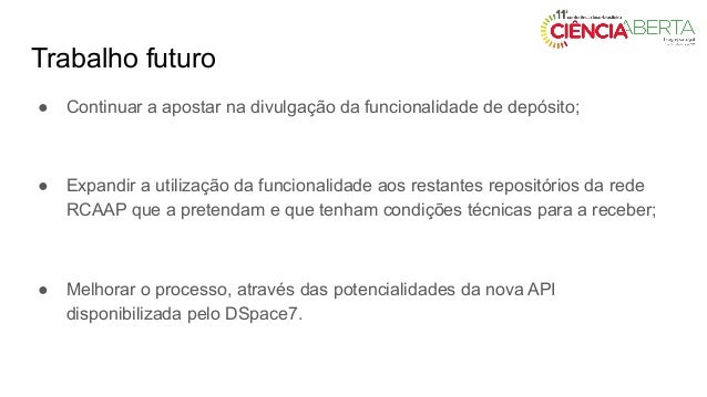 19. 19. Trabalho futuro ● Continuar a apostar na divulgação da funcionalidade de depósito; ● Expandir a utilização da funcionalidade aos restantes repositórios da rede RCAAP que a pretendam e que tenham condições técnicas para a receber; ● Melhorar o processo, através das potencialidades da nova API disponibilizada pelo DSpace7.