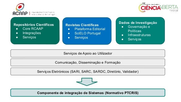 2. 2. Repositórios Científicos ● Core RCAAP ● Integrações ● Serviços Revistas Científicas ● Plataforma Editorial ● SciELO Portugal ● Serviços Dados de Investigação ● Governação e Políticas ● Infraestruturas ● Serviços Serviços Eletrónicos (SARI, SARC, SARDC, Diretório, Validador) Serviços de Apoio ao Utilizador Comunicação, Disseminação e Formação Componente de integração de Sistemas (Normativo PTCRIS)