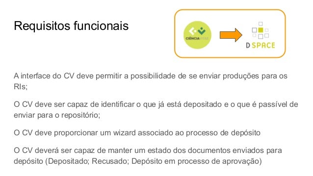 7. 7. Requisitos funcionais A interface do CV deve permitir a possibilidade de se enviar produções para os RIs; O CV deve ser capaz de identificar o que já está depositado e o que é passível de enviar para o repositório; O CV deve proporcionar um wizard associado ao processo de depósito O CV deverá ser capaz de manter um estado dos documentos enviados para depósito (Depositado; Recusado; Depósito em processo de aprovação)