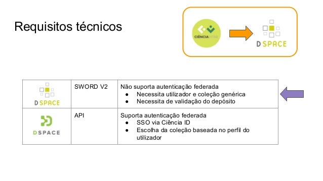 8. 8. Requisitos técnicos SWORD V2 Não suporta autenticação federada ● Necessita utilizador e coleção genérica ● Necessita de validação do depósito API Suporta autenticação federada ● SSO via Ciência ID ● Escolha da coleção baseada no perfil do utilizador