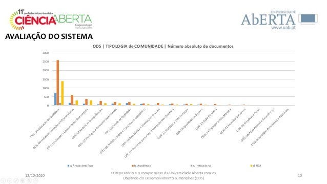 10. 10. 12/10/2020 O Repositório e o compromisso da Universidade Aberta com os Objetivos do Desenvolvimento Sustentável (ODS) 10 AVALIAÇÃO DO SISTEMA 0 500 1000 1500 2000 2500 3000 ODS | TIPOLOGIA de COMUNIDADE | Número absoluto de documentos a. Áreas científicas b. Académico c. Institucional d. REA