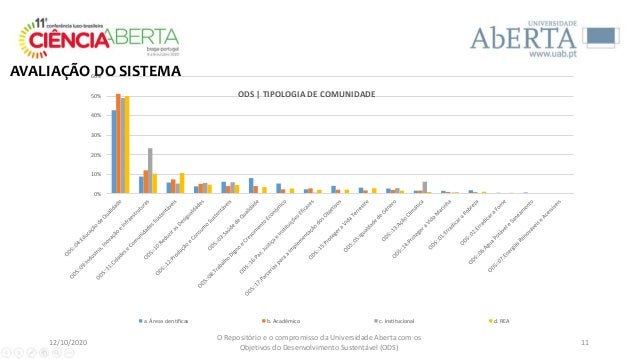 11. 11. 12/10/2020 O Repositório e o compromisso da Universidade Aberta com os Objetivos do Desenvolvimento Sustentável (ODS) 11 AVALIAÇÃO DO SISTEMA 0% 10% 20% 30% 40% 50% 60% ODS | TIPOLOGIA DE COMUNIDADE a. Áreas científicas b. Académico c. Institucional d. REA
