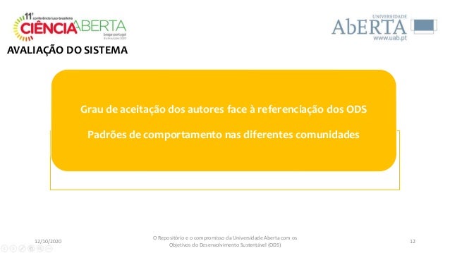12. 12. 12/10/2020 O Repositório e o compromisso da Universidade Aberta com os Objetivos do Desenvolvimento Sustentável (ODS) 12 Grau de aceitação dos autores face à referenciação dos ODS Padrões de comportamento nas diferentes comunidades AVALIAÇÃO DO SISTEMA