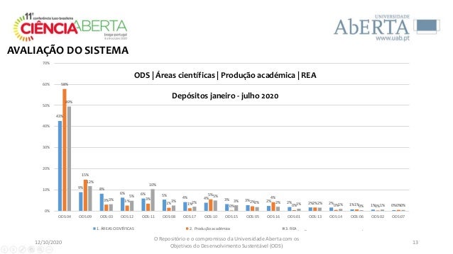 13. 13. 12/10/2020 O Repositório e o compromisso da Universidade Aberta com os Objetivos do Desenvolvimento Sustentável (ODS) 13 AVALIAÇÃO DO SISTEMA ODS | Áreas científicas | Produção académica | REA Depósitos janeiro - julho 2020 43% 9% 8% 6% 6% 5% 4% 4% 3% 3% 2% 2% 2% 2% 1% 1% 0% 58% 15% 3% 3% 3% 1% 1% 5% 0% 2% 4% 0% 2% 0% 1% 0% 0% 49% 12% 3% 5% 10% 3% 2% 5% 3% 2% 2% 1% 2% 1% 0% 1% 0% 0% 10% 20% 30% 40% 50% 60% 70% ODS:04 ODS:09 ODS:03 ODS:12 ODS:11 ODS:08 ODS:17 ODS:10 ODS:15 ODS:05 ODS:16 ODS:01 ODS:13 ODS:14 ODS:06 ODS:02 ODS:07 1. ÁREAS CIENTÍFICAS 2. Produção académica 3. REA (Magazine UAb + Editora eUAb + REA)