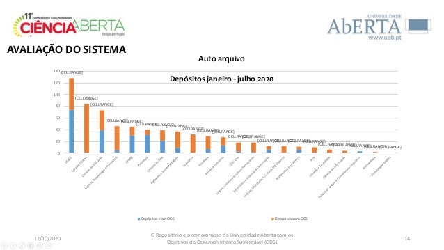 14. 14. 12/10/2020 O Repositório e o compromisso da Universidade Aberta com os Objetivos do Desenvolvimento Sustentável (ODS) 14 AVALIAÇÃO DO SISTEMA Auto arquivo Depósitos janeiro - julho 2020 [CELLRANGE] [CELLRANGE] [CELLRANGE] [CELLRANGE][CELLRANGE] [CELLRANGE][CELLRANGE][CELLRANGE] [CELLRANGE][CELLRANGE][CELLRANGE] [CELLRANGE][CELLRANGE] [CELLRANGE][CELLRANGE][CELLRANGE][CELLRANGE] [CELLRANGE][CELLRANGE][CELLRANGE][CELLRANGE][CELLRANGE] 0 20 40 60 80 100 120 140 Depósitos com ODS Depósitos sem ODS