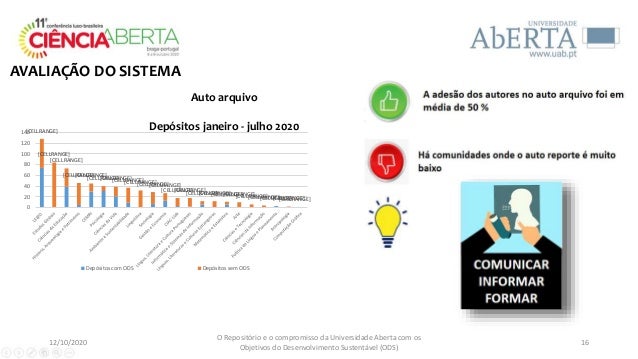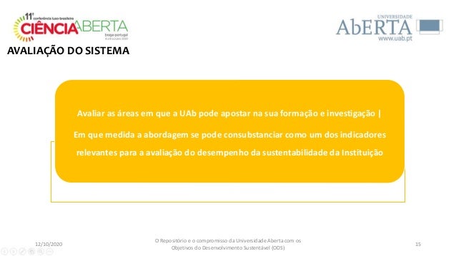 15. 15. 12/10/2020 O Repositório e o compromisso da Universidade Aberta com os Objetivos do Desenvolvimento Sustentável (ODS) 15 Avaliar as áreas em que a UAb pode apostar na sua formação e investigação | Em que medida a abordagem se pode consubstanciar como um dos indicadores relevantes para a avaliação do desempenho da sustentabilidade da Instituição AVALIAÇÃO DO SISTEMA