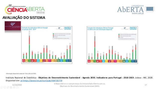 17. 17. AVALIAÇÃO DO SISTEMA 12/10/2020 O Repositório e o compromisso da Universidade Aberta com os Objetivos do Desenvolvimento Sustentável (ODS) 17 Instituto Nacional de Estatística - Objetivos de Desenvolvimento Sustentável - Agenda 2030. Indicadores para Portugal : 2010-2019. Lisboa : INE, 2020. Disponível em: url:https://www.ine.pt/xurl/pub/434725779