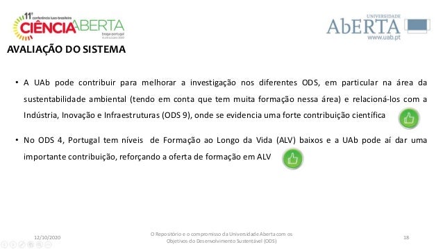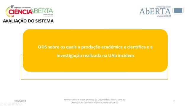 7. 7. 12/10/2020 O Repositório e o compromisso da Universidade Aberta com os Objetivos do Desenvolvimento Sustentável (ODS) 7 ODS sobre os quais a produção académica e científica e a investigação realizada na UAb incidem AVALIAÇÃO DO SISTEMA