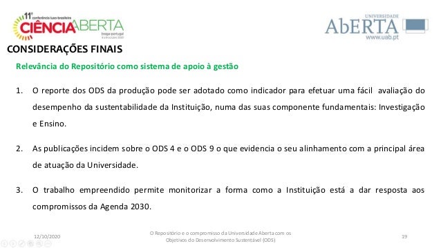 19. 19. Relevância do Repositório como sistema de apoio à gestão 1. O reporte dos ODS da produção pode ser adotado como indicador para efetuar uma fácil avaliação do desempenho da sustentabilidade da Instituição, numa das suas componente fundamentais: Investigação e Ensino. 2. As publicações incidem sobre o ODS 4 e o ODS 9 o que evidencia o seu alinhamento com a principal área de atuação da Universidade. 3. O trabalho empreendido permite monitorizar a forma como a Instituição está a dar resposta aos compromissos da Agenda 2030. 12/10/2020 O Repositório e o compromisso da Universidade Aberta com os Objetivos do Desenvolvimento Sustentável (ODS) 19 CONSIDERAÇÕES FINAIS