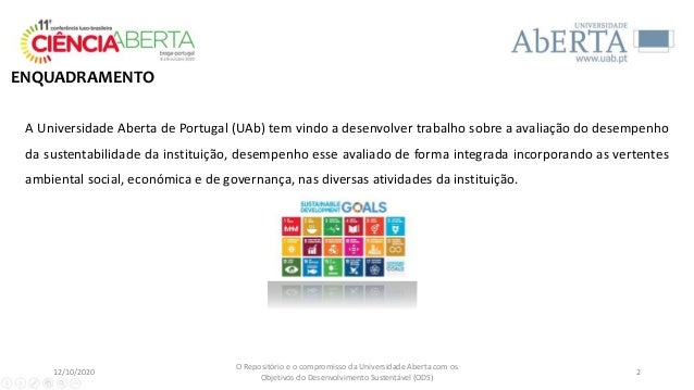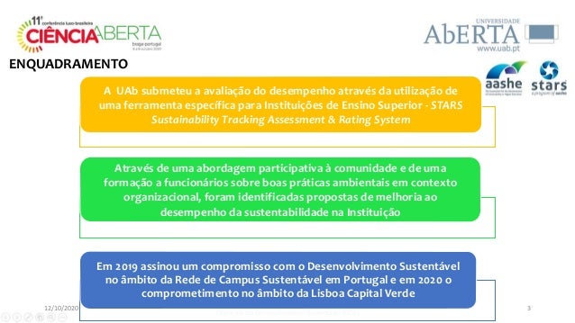 3. 3. 12/10/2020 O Repositório e o compromisso da Universidade Aberta com os Objetivos do Desenvolvimento Sustentável (ODS) 3 A UAb submeteu a avaliação do desempenho através da utilização de uma ferramenta específica para Instituições de Ensino Superior - STARS Sustainability Tracking Assessment & Rating System Através de uma abordagem participativa à comunidade e de uma formação a funcionários sobre boas práticas ambientais em contexto organizacional, foram identificadas propostas de melhoria ao desempenho da sustentabilidade na Instituição Em 2019 assinou um compromisso com o Desenvolvimento Sustentável no âmbito da Rede de Campus Sustentável em Portugal e em 2020 o comprometimento no âmbito da Lisboa Capital Verde ENQUADRAMENTO