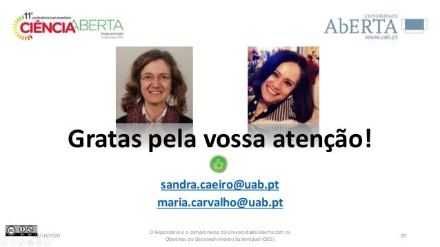 20. 20. Gratas pela vossa atenção! sandra.caeiro@uab.pt maria.carvalho@uab.pt 12/10/2020 O Repositório e o compromisso da Universidade Aberta com os Objetivos do Desenvolvimento Sustentável (ODS) 20