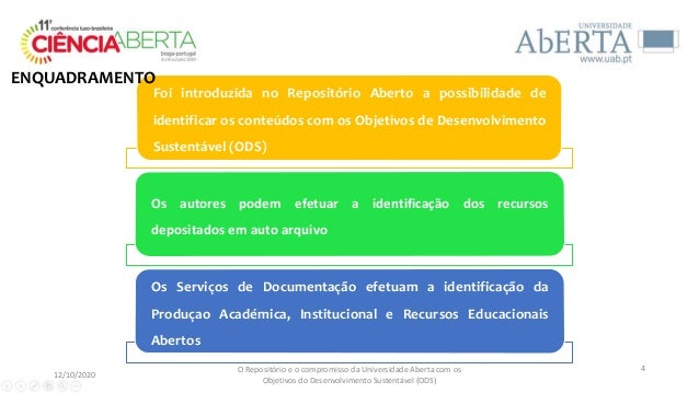 4. 4. 12/10/2020 O Repositório e o compromisso da Universidade Aberta com os Objetivos do Desenvolvimento Sustentável (ODS) 4 Foi introduzida no Repositório Aberto a possibilidade de identificar os conteúdos com os Objetivos de Desenvolvimento Sustentável (ODS) Os autores podem efetuar a identificação dos recursos depositados em auto arquivo Os Serviços de Documentação efetuam a identificação da Produçao Académica, Institucional e Recursos Educacionais Abertos ENQUADRAMENTO