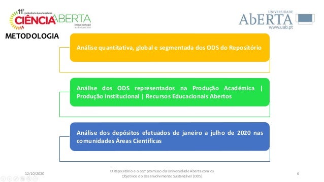 6. 6. 12/10/2020 O Repositório e o compromisso da Universidade Aberta com os Objetivos do Desenvolvimento Sustentável (ODS) 6 Análise quantitativa, global e segmentada dos ODS do Repositório Análise dos ODS representados na Produção Académica | Produção Institucional | Recursos Educacionais Abertos Análise dos depósitos efetuados de janeiro a julho de 2020 nas comunidades Áreas Científicas METODOLOGIA