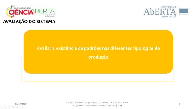 9. 9. 12/10/2020 O Repositório e o compromisso da Universidade Aberta com os Objetivos do Desenvolvimento Sustentável (ODS) 9 Avaliar a existência de padrões nas diferentes tipologias de produção AVALIAÇÃO DO SISTEMA