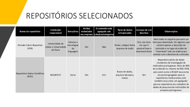 10. 10. REPOSITÓRIOS SELECIONADOS Nome do repositório Instituição responsável Tema/área Atribui metadados aos arquivos O conteúdo está agregado sob coleções/categorias Tipos de dados armazenados Licenças de uso descritas Observações Portulan Clarin Repository (PCR) Universidade de Lisboa e Universidade de Évora Ciências e tecnologias da linguagem Sim Não Textos, códigos-fonte, arquivos de áudio Sim, nos itens em que é possível fazer o download direto Nem todos os registros possuem um item para downloads. Há registros que contem apenas a descrição do conteúdo e no lugar do botão de "download" está um atalho para contato com o detentor do conteúdo. Repositório Dados Científicos (RDC) RCAAP/FCT Geral Sim Sim Bases de dados, arquivos tabulares, textos Sim Repositório piloto de dados resultantes de investigação de instituições portuguesas. Mais de 90% do conteúdo é o mesmo do RDC-IPCB, pois assim como o RCAAP atua como um portal agregador para os repositórios institucionais, este também atua como um agregador para os repositórios (ou coleções) de dados de pesquisa das instituições de pesquisa portuguesas.