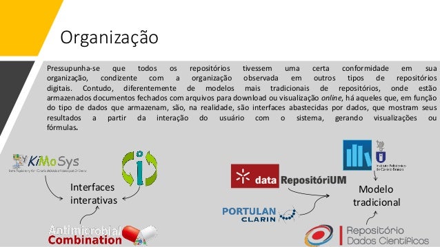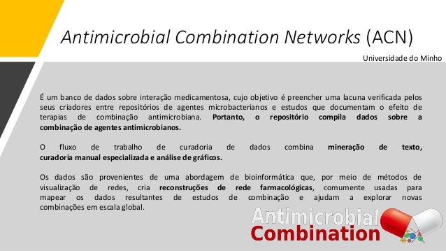 11. 11. Antimicrobial Combination Networks (ACN) É um banco de dados sobre interação medicamentosa, cujo objetivo é preencher uma lacuna verificada pelos seus criadores entre repositórios de agentes microbacterianos e estudos que documentam o efeito de terapias de combinação antimicrobiana. Portanto, o repositório compila dados sobre a combinação de agentes antimicrobianos. O fluxo de trabalho de curadoria de dados combina mineração de texto, curadoria manual especializada e análise de gráficos. Os dados são provenientes de uma abordagem de bioinformática que, por meio de métodos de visualização de redes, cria reconstruções de rede farmacológicas, comumente usadas para mapear os dados resultantes de estudos de combinação e ajudam a explorar novas combinações em escala global. Universidade do Minho