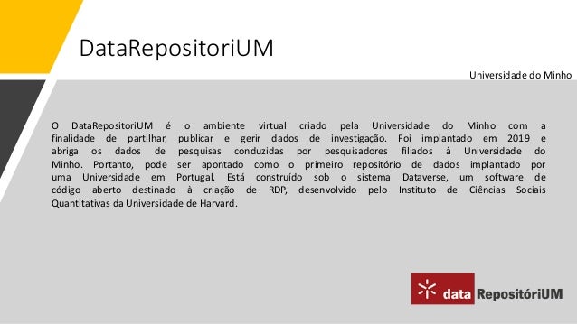 12. 12. DataRepositoriUM O DataRepositoriUM é o ambiente virtual criado pela Universidade do Minho com a finalidade de ​partilhar, publicar e gerir dados de investigação. Foi implantado em 2019 e abriga os dados de pesquisas conduzidas por pesquisadores filiados à Universidade do Minho. Portanto, pode ser apontado como o primeiro repositório de dados implantado por uma Universidade em Portugal. Está construído sob o sistema Dataverse, um software de código aberto destinado à criação de RDP, desenvolvido pelo Instituto de Ciências Sociais Quantitativas da Universidade de Harvard. Universidade do Minho
