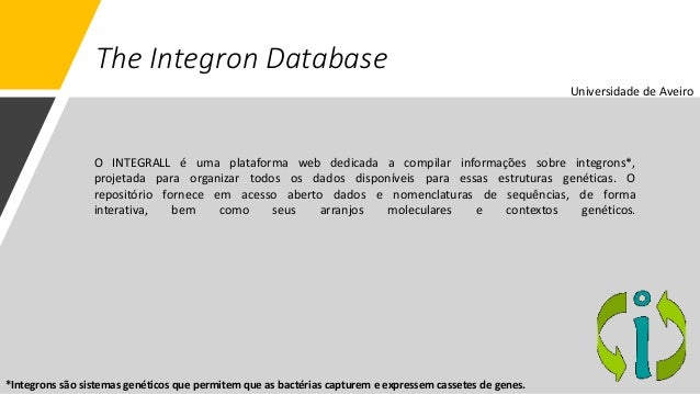 13. 13. The Integron Database O INTEGRALL é uma plataforma web dedicada a compilar informações sobre integrons*, projetada para organizar todos os dados disponíveis para essas estruturas genéticas. O repositório fornece em acesso aberto dados e nomenclaturas de sequências, de forma interativa, bem como seus arranjos moleculares e contextos genéticos. Universidade de Aveiro *Integrons são sistemas genéticos que permitem que as bactérias capturem e expressem cassetes de genes.