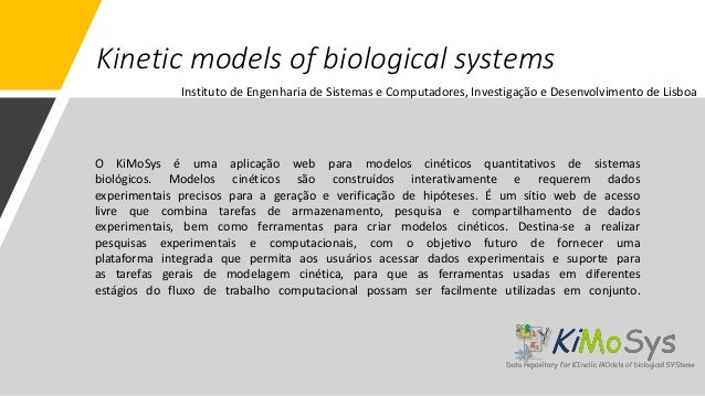 14. 14. Kinetic models of biological systems O KiMoSys é uma aplicação web para modelos cinéticos quantitativos de sistemas biológicos. Modelos cinéticos são construídos interativamente e requerem dados experimentais precisos para a geração e verificação de hipóteses. É um sítio web de acesso livre que combina tarefas de armazenamento, pesquisa e compartilhamento de dados experimentais, bem como ferramentas para criar modelos cinéticos. Destina-se a realizar pesquisas experimentais e computacionais, com o objetivo futuro de fornecer uma plataforma integrada que permita aos usuários acessar dados experimentais e suporte para as tarefas gerais de modelagem cinética, para que as ferramentas usadas em diferentes estágios do fluxo de trabalho computacional possam ser facilmente utilizadas em conjunto. Instituto de Engenharia de Sistemas e Computadores, Investigação e Desenvolvimento de Lisboa