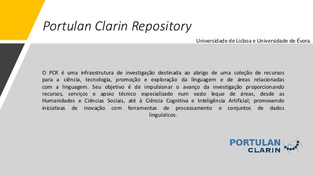 15. 15. Portulan Clarin Repository O PCR é uma infraestrutura de investigação destinada ao abrigo de uma coleção de recursos para a ciência, tecnologia, promoção e exploração da linguagem e de áreas relacionadas com a linguagem. Seu objetivo é de impulsionar o avanço da investigação proporcionando recursos, serviços e apoio técnico especializado num vasto leque de áreas, desde as Humanidades e Ciências Sociais, até à Ciência Cognitiva e Inteligência Artificial; promovendo iniciativas de inovação com ferramentas de processamento e conjuntos de dados linguísticos. Universidade de Lisboa e Universidade de Évora
