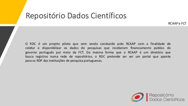 16. 16. Repositório Dados Científicos O RDC é um projeto piloto que vem sendo conduzido pelo RCAAP com a finalidade de coletar e disponibilizar os dados de pesquisas que receberam financiamento público do governo português por meio da FCT. Da mesma forma que o RCAAP é um diretório que busca registros numa rede de repositórios, o RDC pretende ser ser um portal que aponte para os RDP das instituições de pesquisa portuguesas. RCAAP e FCT
