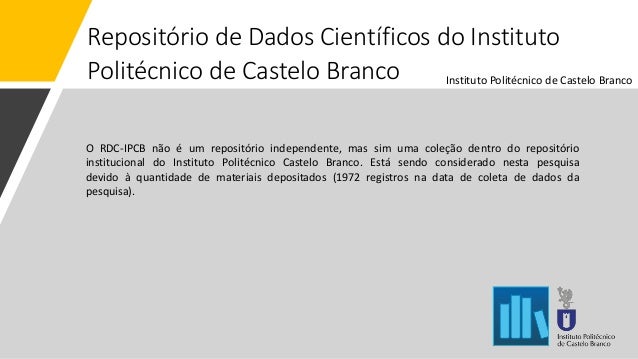 17. 17. Repositório de Dados Científicos do Instituto Politécnico de Castelo Branco O RDC-IPCB não é um repositório independente, mas sim uma coleção dentro do repositório institucional do Instituto Politécnico Castelo Branco. Está sendo considerado nesta pesquisa devido à quantidade de materiais depositados (1972 registros na data de coleta de dados da pesquisa). Instituto Politécnico de Castelo Branco