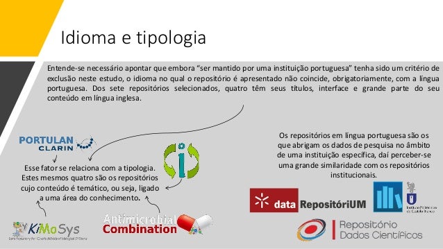 18. 18. Idioma e tipologia Entende-se necessário apontar que embora “ser mantido por uma instituição portuguesa” tenha sido um critério de exclusão neste estudo, o idioma no qual o repositório é apresentado não coincide, obrigatoriamente, com a língua portuguesa. Dos sete repositórios selecionados, quatro têm seus títulos, interface e grande parte do seu conteúdo em língua inglesa. Esse fator se relaciona com a tipologia. Estes mesmos quatro são os repositórios cujo conteúdo é temático, ou seja, ligado a uma área do conhecimento. Os repositórios em língua portuguesa são os que abrigam os dados de pesquisa no âmbito de uma instituição específica, daí perceber-se uma grande similaridade com os repositórios institucionais.