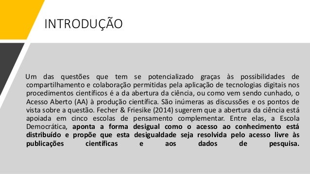 2. 2. INTRODUÇÃO Um das questões que tem se potencializado graças às possibilidades de compartilhamento e colaboração permitidas pela aplicação de tecnologias digitais nos procedimentos científicos é a da abertura da ciência, ou como vem sendo cunhado, o Acesso Aberto (AA) à produção científica. São inúmeras as discussões e os pontos de vista sobre a questão. ​Fecher & Friesike (2014) sugerem que a abertura da ciência está apoiada em cinco escolas de pensamento complementar. Entre elas, a Escola Democrática, aponta a forma desigual como o acesso ao conhecimento está distribuído e propõe que esta desigualdade seja resolvida pelo acesso livre às publicações científicas e aos dados de pesquisa.