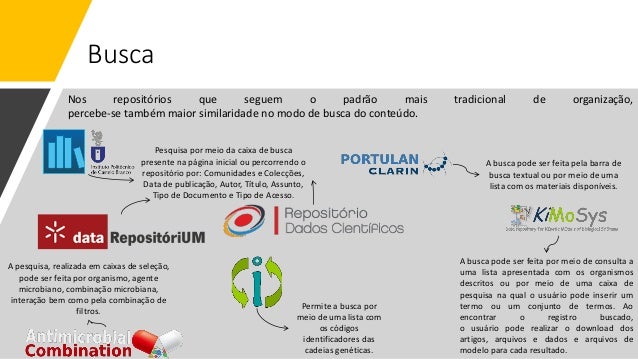 20. 20. Busca Nos repositórios que seguem o padrão mais tradicional de organização, percebe-se também maior similaridade no modo de busca do conteúdo. Pesquisa por meio da caixa de busca presente na página inicial ou percorrendo o repositório por: Comunidades e Colecções, Data de publicação, Autor, Título, Assunto, Tipo de Documento e Tipo de Acesso. A busca pode ser feita pela barra de busca textual ou por meio de uma lista com os materiais disponíveis. A pesquisa, realizada em caixas de seleção, pode ser feita por organismo, agente microbiano, combinação microbiana, interação bem como pela combinação de filtros. Permite a busca por meio de uma lista com os códigos identificadores das cadeias genéticas. A busca pode ser feita por meio de consulta a uma lista apresentada com os organismos descritos ou por meio de uma caixa de pesquisa na qual o usuário pode inserir um termo ou um conjunto de termos. Ao encontrar o registro buscado, o usuário pode realizar o download dos artigos, arquivos e dados e arquivos de modelo para cada resultado.