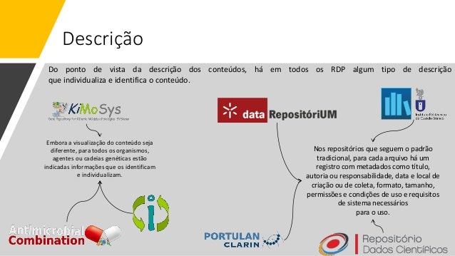 21. 21. Descrição Embora a visualização do conteúdo seja diferente, para todos os organismos, agentes ou cadeias genéticas estão indicadas informações que os identificam e individualizam. Nos repositórios que seguem o padrão tradicional, para cada arquivo há um registro com metadados como título, autoria ou responsabilidade, data e local de criação ou de coleta, formato, tamanho, permissões e condições de uso e requisitos de sistema necessários para o uso. Do ponto de vista da descrição dos conteúdos, há em todos os RDP algum tipo de descrição que individualiza e identifica o conteúdo.
