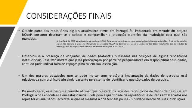 23. 23. CONSIDERAÇÕES FINAIS • Grande parte dos repositórios digitais atualmente ativos em Portugal foi implantada em virtude do projeto RCAAP, portanto destinam-se a coletar e compartilhar a produção científica da instituição pela qual são mantidos. • Observou-se a presença de conjuntos de dados (datasets) publicados nas coleções de alguns repositórios institucionais. Esse fato mostra que já há preocupação por parte de pesquisadores em disponibilizar seus dados, contudo pode indicar falta de espaços para tal em sua instituição. • Um dos maiores obstáculos que se pode indicar com relação à implantação de dados de pesquisa está relacionada com a dificuldade ainda bastante persistente de identificar o que são dados de pesquisa. • De modo geral, essa pesquisa permite afirmar que o estado da arte dos repositórios de dados de pesquisa em Portugal ainda encontra-se em estágio inicial. Pela pouca quantidade de repositórios e de itens armazenados nos repositórios analisados, acredita-se que os mesmos ainda tenham pouca visibilidade dentro de suas instituições. Até ao final de 2009 as actividades do projecto RCAAP focaram-se exclusivamente nos repositórios de literatura científica. O plano de trabalho para 2010 assinala o início da intervenção do projecto RCAAP no domínio do acesso e curadoria dos dados resultantes das actividades de investigação e dos repositórios de dados científicos (Rodrigues et al., 2010).
